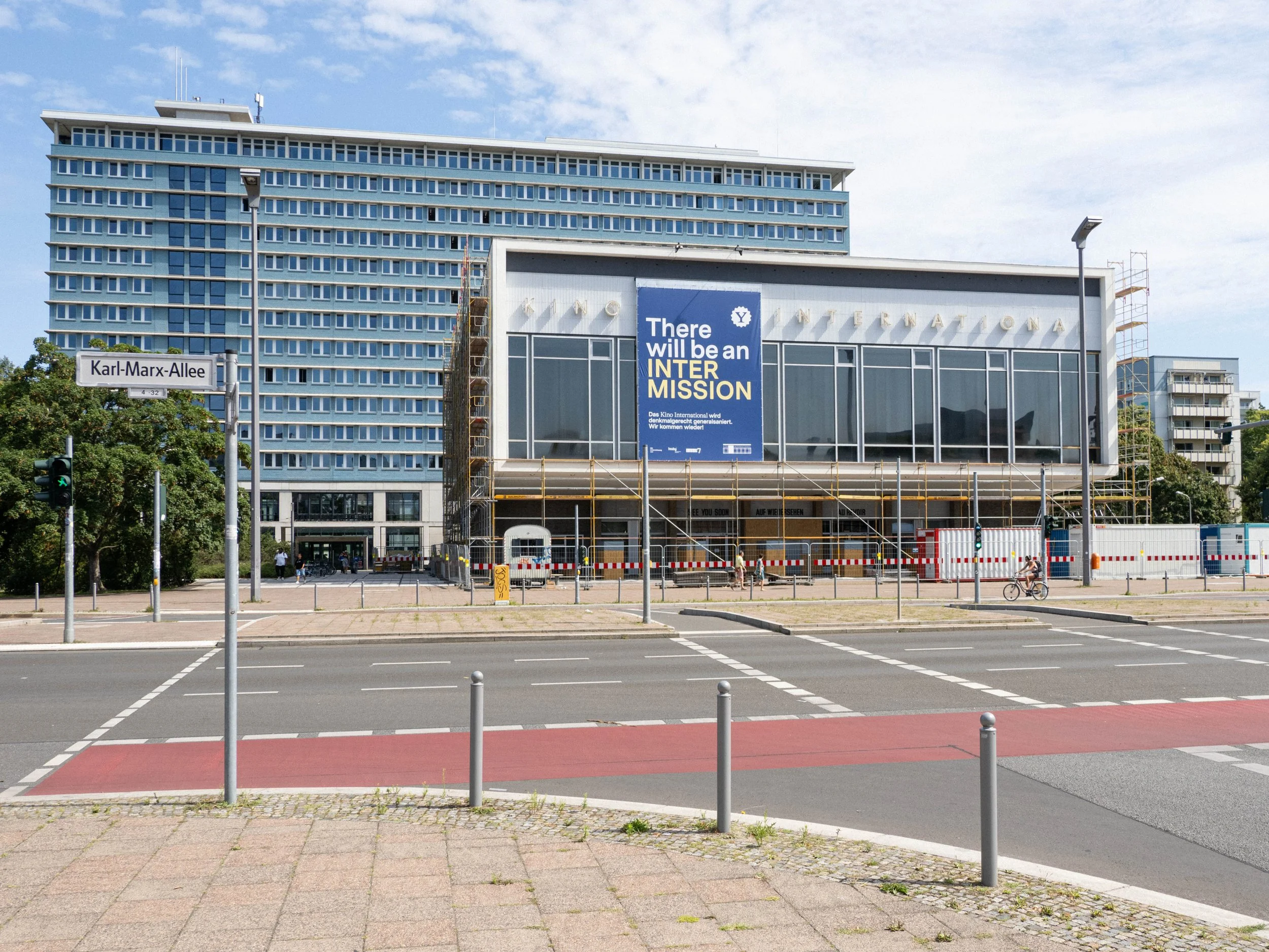 Das Kino Kosmos war nur ein erster Ausdruck der neuen DDR-Architektur der 1960er Jahre. Die Bauten der Karl-Marx-Allee westlich des Strausberger Platzes in Richtung Alexanderplatz setzen den Stil fort. Markant ist hier eine weitere Vergnügungsstätte, das Kino International, momentan aufgrund umfangreicher Sanierungsmaßnahmen eingerüstet. Dahinter das Rathaus des Bezirks Mitte.